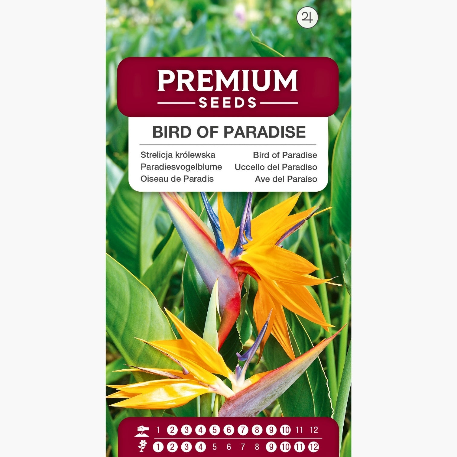 Die Paradiesvogelblume zählt zu den eindrucksvollsten Zierpflanzen für Haus, Terrasse und Wintergarten. Mit einer Wuchshöhe von etwa 120 cm bildet diese mehrjährige Kultur ausladende, kräftige Büschel und überzeugt durch ihre exotische Erscheinung. Besonders charakteristisch sind die auffälligen Blütenstände mit leuchtend orangefarbenen Hochblättern und markanten blauen Mittelnerven, die an einen Vogelkopf erinnern. Die robuste Struktur der festen Laubblätter sorgt für eine attraktive Optik über das ganze Jahr hinweg. Neben dem außergewöhnlichen Zierwert schätzen erfahrene Gärtner vor allem die lange Blütezeit von September bis April, wodurch sich diese bewährte Sorte als dauerhafter Blickfang eignet. Botanisch wird sie als Strelitzia reginae geführt und ist seit Jahrzehnten fester Bestandteil anspruchsvoller Pflanzensammlungen.