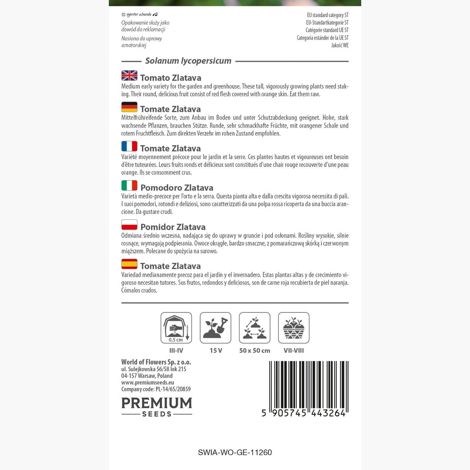Die Tomate Zlatava (Solanum lycopersicum) ist eine mittelfrühreifende Sorte, die sich sowohl für den Anbau im Freiland als auch unter Schutzabdeckungen eignet. Diese Sorte besticht durch ihre schönen, runden Früchte, die eine leuchtend orangefarbene Schale und ein rotes, saftiges Fruchtfleisch haben. Der Geschmack der Tomaten ist außergewöhnlich aromatisch, wodurch sie sich hervorragend für den direkten Verzehr im rohen Zustand eignen.