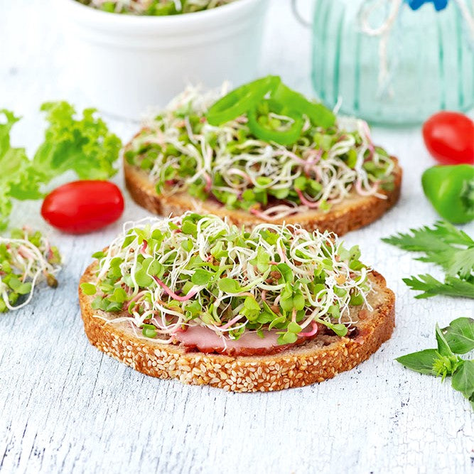 Die Keimsprossen des Rettich Daikon zeichnen sich durch ihren angenehm pikanten, leicht scharfen Geschmack aus und bereichern viele Gerichte mit einer frischen, aromatischen Note. Diese Sorte bildet kräftige, grüne Sprossen mit zarten Stängeln und feinen Keimblättern, die bereits nach 3 bis 5 Tagen erntereif sind. Daikon-Sprossen sind besonders beliebt als Topping für Salate, belegte Brote, Quark oder Dips und liefern wertvolle Vitamine sowie Mineralstoffe für eine ausgewogene Ernährung.