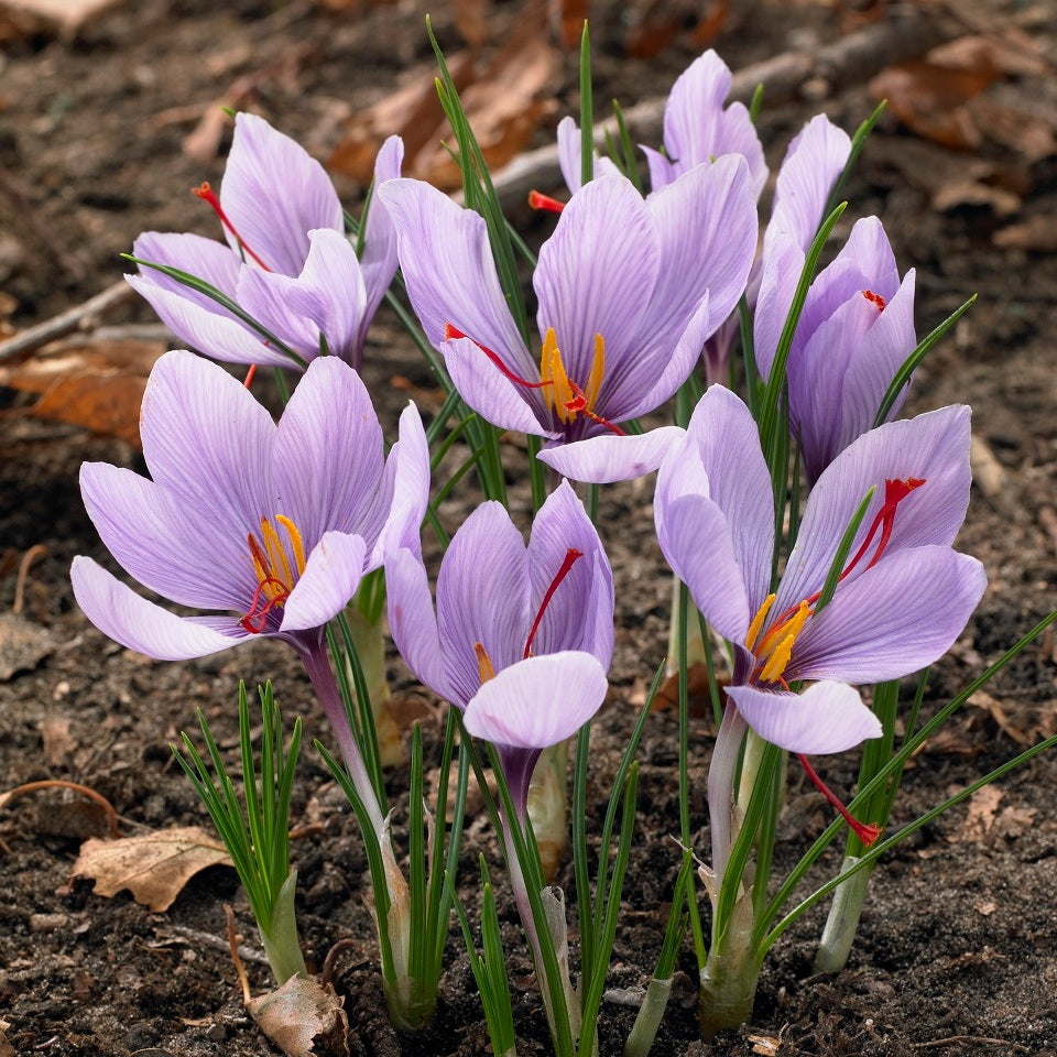Zarte Herbstfarben und eine feine, fast transparente Anmutung kennzeichnen den Safran-Krokus, dessen hellviolette Blüten selbst an trüberen Tagen leuchtend hervorstechen. Zwischen den sanft gekrümmten Blütenblättern ragen die leuchtend roten Narben hervor, die diesen Krokus zu einer botanischen Besonderheit machen. Der kompakte, gleichmäßige Wuchs wirkt harmonisch und fügt sich sowohl in formale Pflanzungen als auch in naturnahe Gestaltung ein, wobei die Pflanze ihre dekorative Wirkung im Spätherbst in besonderem Maße entfaltet. Gerade in dieser Jahreszeit, wenn viele Stauden schon zurückgehen, setzt der Safran-Krokus einen klaren farblichen Akzent.