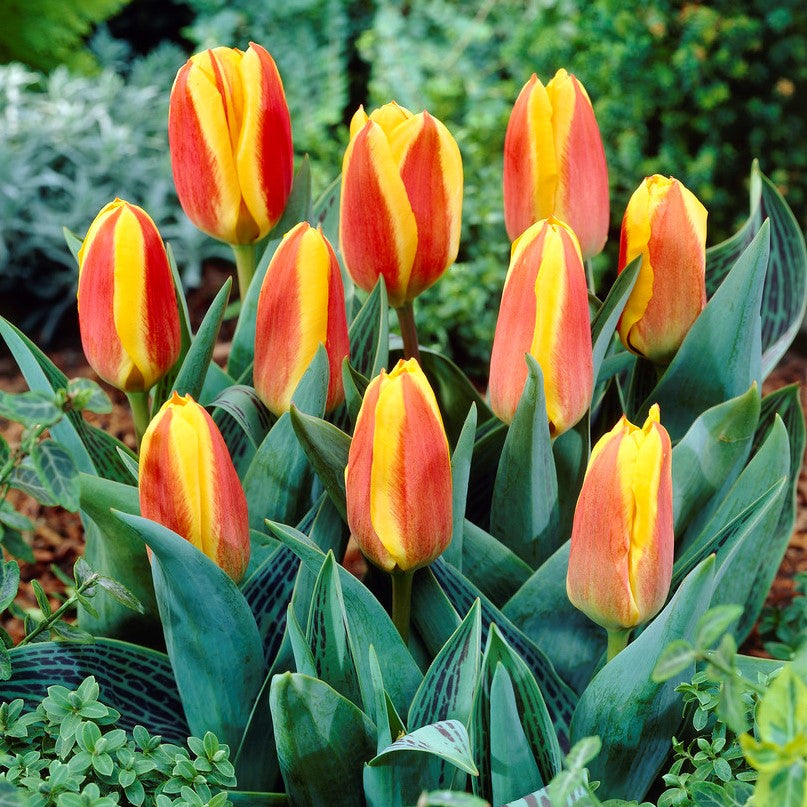 Die Blüten dieser Sorte öffnen sich weit und zeigen ein intensives Rot, das von klar abgegrenzten, goldgelben Flammen durchzogen wird. Diese Farbgebung wirkt in der Frühlingssonne besonders lebendig, während das breit geformte, teils leicht gewellte Laub in sattem Grün einen reizvollen Kontrast bildet. Dank eines stabilen Stängelbaus bleibt die Greigii-Tulpe - Rot-Gelb auch bei stärkerem Wind oder kurzen Regenschauern aufrecht. Ihre gleichmäßige Wuchsform erzeugt ein geordnetes Erscheinungsbild, wodurch sie sich harmonisch in strukturierte wie auch in naturnahe Pflanzungen einfügt.