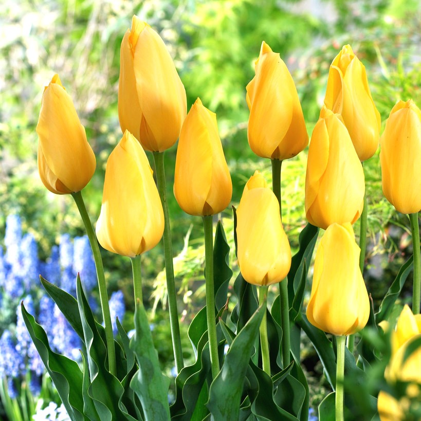 Die Wuchsform zeigt sich schlank und zugleich standfest, was vor allem an den langen, stabilen Stielen und der gleichmäßigen Blattstellung liegt. Das Laub ist kräftig grün, glatt texturiert und besitzt einen leicht wachsartigen Glanz, der die frische Anmutung zusätzlich unterstreicht. Während die Blätter in lockeren Gruppen den Boden schmücken, trägt jeder Stiel eine makellos geformte Einzelblüte, deren strahlende Farbe auch an trüben Tagen Leuchtkraft entfaltet. Auffällig ist zudem die Gleichmäßigkeit der Blütengröße, die in gut gepflegten Beständen zu einem besonders homogenen Erscheinungsbild führt.