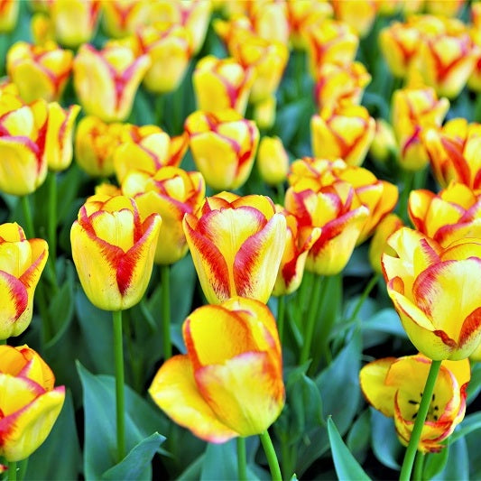 Frühe Frühlingstage erhalten mit der Tulpe Cape Town eine leuchtende Note, die Wärme und Vitalität in jede Pflanzung bringt. Die großen, kelchförmigen Blüten entfalten ein leuchtendes Gelb, das von einem intensiven, flammenartigen Rot überzogen wird. Dieser ausdrucksvolle Farbverlauf sorgt in Kombination mit dem frischen Grün des Laubs für eine harmonische, zugleich spannungsvolle Wirkung. Die insgesamt aufrechte Erscheinung wirkt klar strukturiert und lässt sich sowohl als Solitärakzent als auch in üppigen Gruppenarrangements wirkungsvoll inszenieren.