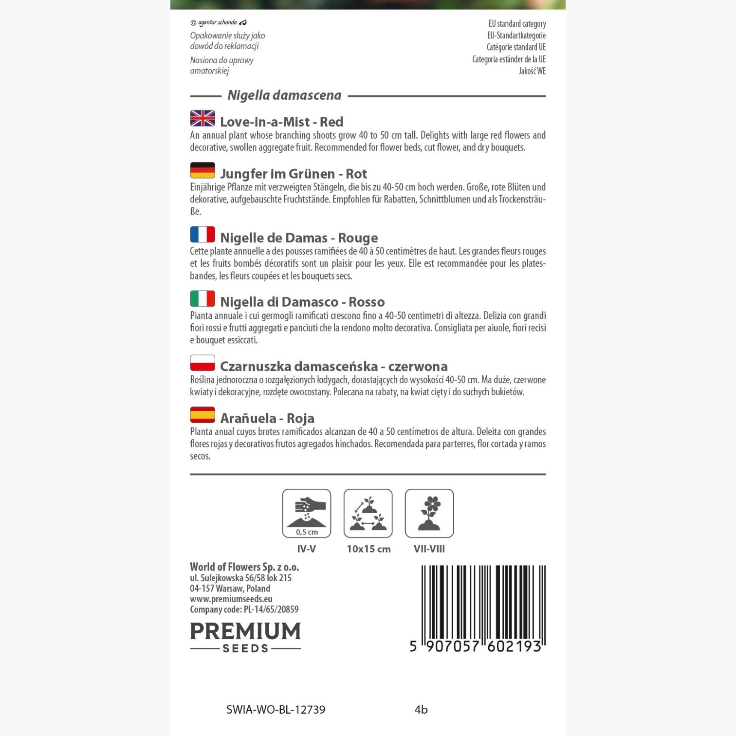 Die bewährte Sorte Jungfer im Grünen - Rot überzeugt als einjährige Blühpflanze mit besonders attraktiven, roten Blüten und markanten, aufgebauschten Fruchtständen. Mit einer Wuchshöhe von 40-50 cm und verzweigten Stängeln eignet sich diese Züchtung hervorragend für vielfältige Gartenbereiche. Die charakteristischen Blüten zeigen sich in kräftigem Rot und setzen farbliche Akzente in Rabatten oder Staudenbeeten. Botanisch gehört die Kulturpflanze zur Familie der Hahnenfußgewächse und wird unter dem Namen Nigella damascena geführt. Der hohe Zierwert entsteht durch das Zusammenspiel aus filigranem Laub, leuchtenden Blütenfarben und den dekorativen Samenkapseln, die auch nach der Blüte noch lange attraktiv bleiben. Besonders geschätzt wird diese Art wegen ihrer Vielseitigkeit im Gartenbau sowie ihrer unkomplizierten Kulturführung.