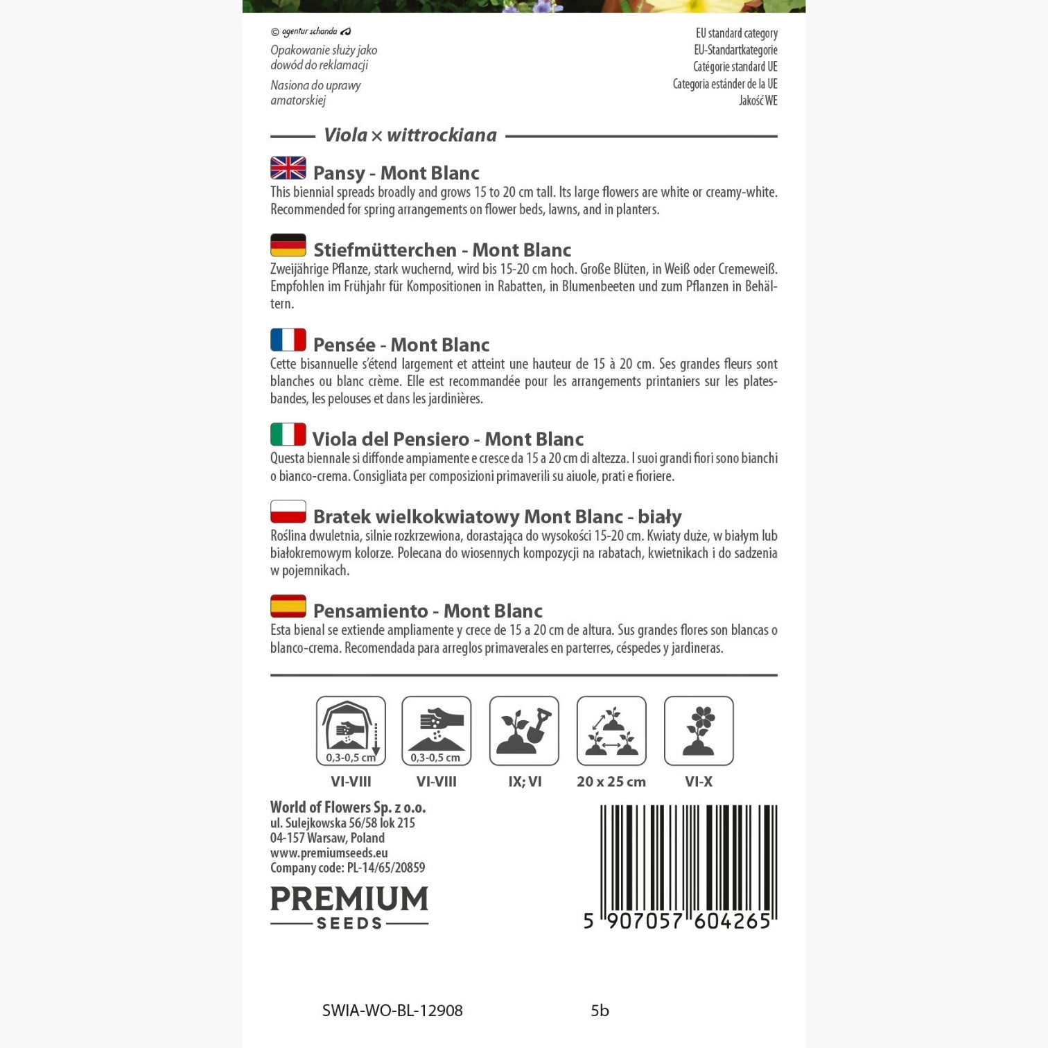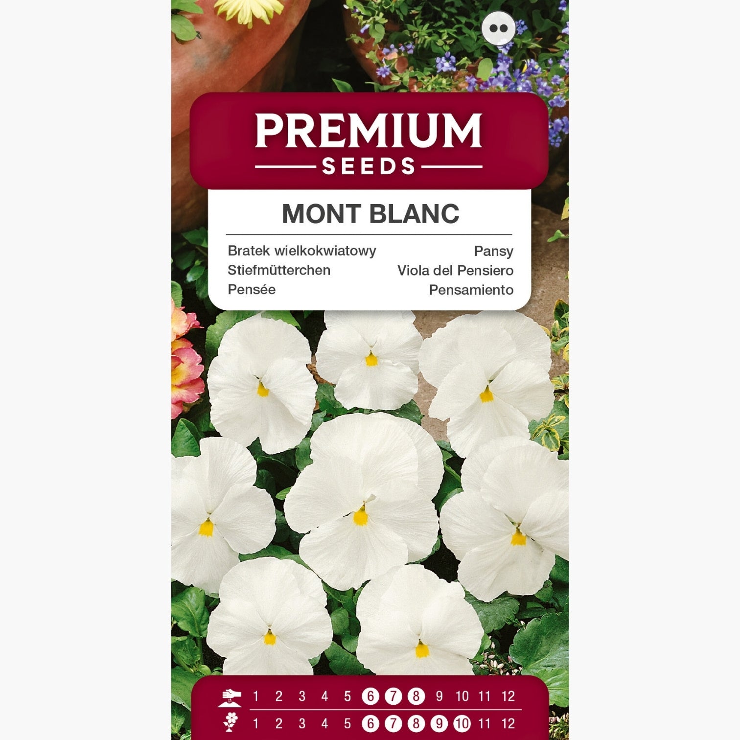 Mit dem Stiefmütterchen Mont Blanc setzen Sie auf eine traditionsreiche Sorte mit zuverlässigem Wuchsverhalten, langer Blühdauer von VI bis X sowie vielfältigen Einsatzmöglichkeiten im privaten Gartenbau wie auch im öffentlichen Bereich. Die unkomplizierte Anzucht gelingt sowohl Anfängern als auch erfahrenen Hobbygärtnern problemlos unter den typischen Bedingungen des deutschen Klimas - so bleibt Ihr Garten über viele Wochen hinweg ein attraktiver Blickfang.