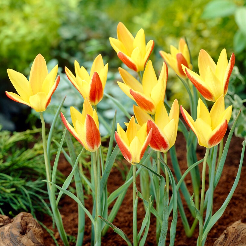 Die aufrechte, kompakte Wuchsform dieser Sorte wird von standfesten, kräftig grünen Stängeln getragen, die selbst wechselhafter Witterung im Frühling standhalten. Schlanke, längliche Blätter bilden einen klaren Rahmen für die wiederkehrend zweifarbigen Blüten, deren warme Gelbgrundlage von intensiven Rottönen überzogen ist. Diese Farbkombination wirkt aus der Nähe detailreich und aus der Ferne strahlend. Die glatte, frische Blatttextur betont das leuchtende Farbspiel, während die Proportion zwischen Blüte und Laub für eine ausgewogene, elegante Gesamtwirkung sorgt.